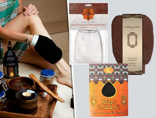Когда на полноценное спа нет времени, на помощь арабским красавицам приходит перчатка kessa. Обычно ее делают из скрученных хлопковых нитей — за счет этого она получается очень прочной, но деликатной. Перед использованием рукавицы принимают ванну, чтобы кожа распарилась, а после начинают интенсивный массаж. Почти сразу появляются катышки — свидетельство того, что вы все делаете правильно. Но будьте осторожны: не травмируйте участки с нежной кожей.
