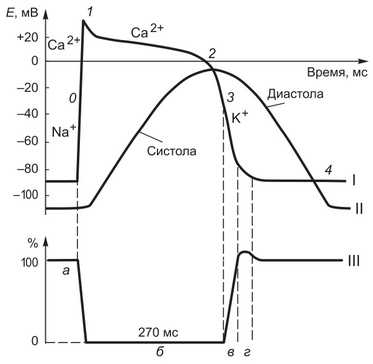 Поступающий из проводящей системы к кардиомиоцитам через каналы щелевых контактов потенциал действия деполяризует их мембрану. Когда величина деполяризации достигает критического уровня (около -60 мВ), изменяют свою пространственную конформацию активационные ворота быстрых потенциалзависимых натриевых каналов и через открывающиеся каналы поток ионов Na + по градиентам электрического поля и концентрации устремляется в миоцит, быстро деполяризует и вскоре перезаряжает мембрану — фаза 0 потенциала действия (рис. 1). Проницаемость мембраны для ионов Na+ за период времени, пока открыты активационные ворота, возрастает в несколько сот раз но сравнению с проницаемостью в состоянии покоя. Смена заряда на мембране, поляризованной до +20 мВ, сопровождается закрытием инактивационных ворот натриевых каналов и прекращением входа ионов Na+ в миоцит. Инактивационные ворота натриевых каналов остаются закрытыми до момента, пока мембрана клетки не будет частично реполяризована в фазу 3 потенциала действия. В течение времени от момента активации — открытия натриевых каналов в фазу 0 до их реактивации в фазу 3 мембрана кардиомиоцитов находится в состоянии абсолютной рефрактерности и, таким образом, никакие воздействия на ее в это время не могут вызвать на мембране новый процесс возбуждения и сокращения миокарда.