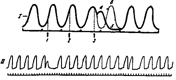 Рис. 22. Экстрасистола и компенсаторная пауза. I - момента поступления имульсов из сино-атриального узла; 1,2,3-моменты нанесения экстрараздражений; 4 - экстрасистола; 5 - компенсаторная пауза; 6 - выпавшее очередное сокращение (обозначено пунктиром). II - кардиограмма лягушки с экстрасистолами.