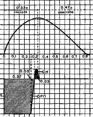 АРП - фаза абсолютной рефрактерности; ОРП - фаза относительной рефрактерности; СН - фаза экзальтации. Цифрами обозначена длительность фаз сердечного цикла и возбудимости.