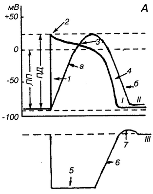 Быстрое развитие деполяризации (0) и продолжительная реполяризация (1, 2, 3). Замедленная реполяризация - 2 (плато) переходит в быструю реполяризацию - 3.
