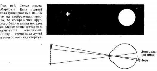 Слепое пятно. Место входа зрительного нерва в глазное яблоко — сосок зрительного нерва — не содержит фоторецепторов и поэтому нечувствительно к свету; это так называемое слепое пятно . В существовании слепого пятна можно убедиться с помощью опыта Мариотта . Если, закрыв левый глаз, правым фиксировать крест, изображенный на рис. 215, то при определенном расстоянии рисунка от глаз (от 10 до 25 см, т.е. от 0,1 до 0,25 м) круг исчезает, так как его изображение падает на слепое пятно.