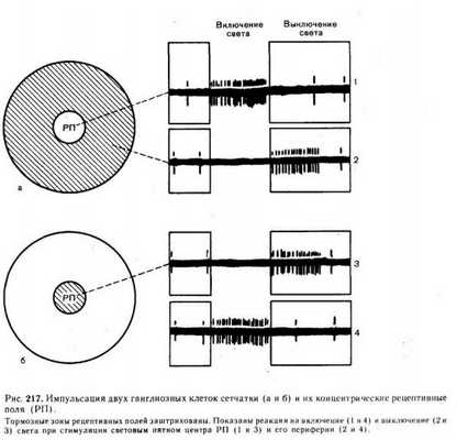 Различают три основных типа ганглиозных клеток; отвечающие на включение света ( оn-реакция ), его выключение ( off-реакция ) и на то и другое ( on-off-реакция ) (рис. 217). Отведение импульсов от одиночного волокна зрительного нерва микроэлектродом при точечном световом раздражении разных участков сетчатки позволило исследовать рецептивные поля ганглиозных клеток , т. е. ту часть поля рецепторов, на стимуляцию которой нейрон отвечает импульсным разрядом. Оказалось, что в центре сетчатки рецептивные поля маленькие, а на периферии сетчатки они значительно больше по диаметру. Форма их круглая, причем построены эти поля в большей части случаев концентрически: возбудительный центр и тормозная периферическая кольцевая зона или наоборот .