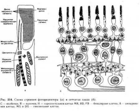 Каждый фоторецептор — палочка или колбочка — состоит из чувствительного к действию света наружного сегмента, содержащего зрительный пигмент, и внутреннего сегмента, содержащего ядро и митохондрии, обеспечивающие энергетические процессы в фоторецепторной клетке.