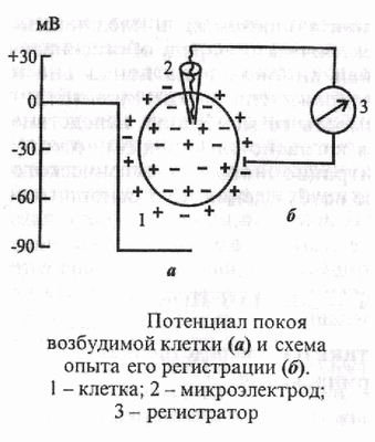 Потенциал покоя (ПП) - разность элетрических потенциалов между наружной и внутренней сторонами клеточной мембраны. Его величина в нервных клетках составляет 60-80 мВ. При регистрации ПП луч осциллографа во время прокола мембраны клетки микроэлектродом скачком отклоняется и показывает отрицательный заряд внутри клетки (рисунок 1).