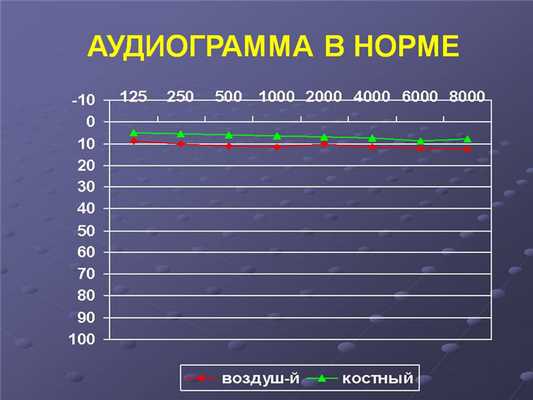 У здорового человека аудиограмма - это две почти прямых линии без ярко выраженного костно-воздушного разрыва между ними, причем точки, по которым строятся данные кривые находятся не превышают 20 дБ на графике. Это означает, что восприятие всех частот хорошее, ровное. Разница между воздушной и костной проводимостью должна оставлять не больше 10 дБ. Причем линия второй находится над линией первой. В соответствующей таблице норма прописана для всех кривых.