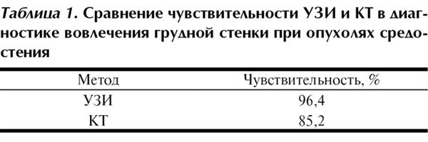Таблица 1. Сравнение чувствительности УЗИ и КТ в диагностике вовлечения грудной стенки при опухолях средостения