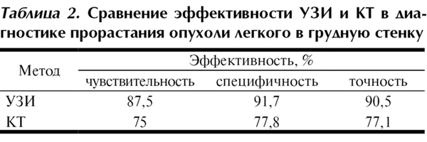 Таблица 2. Сравнение эффективности УЗИ и КТ в диагностике прорастания опухоли легкого в грудную стенку