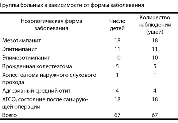 Больных с наличием ателектаза барабанной перепонки относили к группе с адгезивным средним отитом (4 больных, 6% случаев). Также была выделена группа пациентов с рецидивом заболевания — 18 (26,9%), которым ранее проводилось хирургическое лечение по поводу ХГСО (см. таблицу).