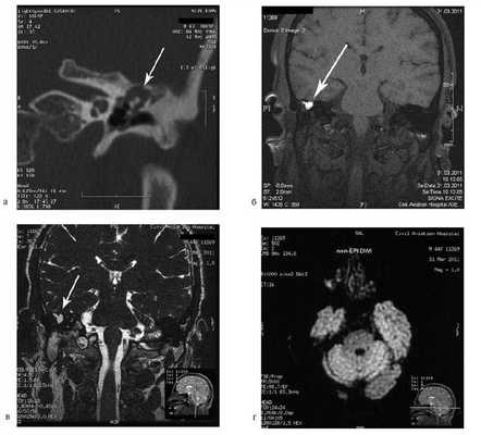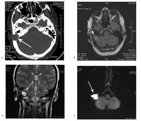 На КТ правой височной кости определяется затемнение в области аттика и антрума, цепь слуховых косточек сохранена (рис. 3, а). Рисунок 3. КТ и МРТ височных костей больного А. с адгезивным средним отитом справа, фиброзной облитерацией аттика. а — КТ; б — МРТ основания черепа в режиме Т1; в — в режиме Т2; г — в режиме non-EPI DWI.
