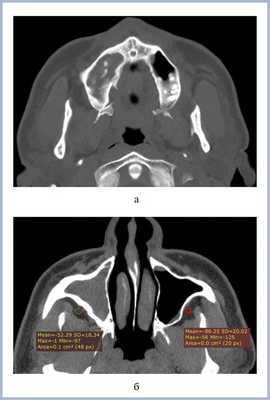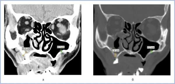 Воспалительные изменения слизистой оболочки верхнечелюстной пазухи, существующие в течение длительного времени, вовлекают в процесс костную стенку. На компьютерных томограммах отмечается утолщение костной стенки в костном режиме и появление «оптического эффекта» — уплотнение стенки в 1,5—3 раза за счет отека надкостницы — при просмотре в мягкотканом режиме (рис. 1, а, б) [9]. При одностороннем процессе, характерном для одонтогенного поражения, на контралатеральной интактной стороне такого эффекта не определяется.