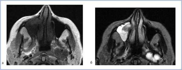 Рис. 6. Магнитно-резонансная томограмма верхнечелюстных пазух, изображения в режимах Т1 (а) и Т2 (б), аксиальная проекция.