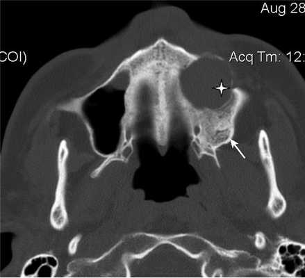 При МРТ-исследовании у 8 (80%) больных определялось асимметричное снижение интенсивности сигнала в режиме Т1 от ретромаксиллярной клетчатки, а ее истончение выявилось в 3 (30%) случаях. Изменений со стороны костной стенки у этих больных не выявлено.