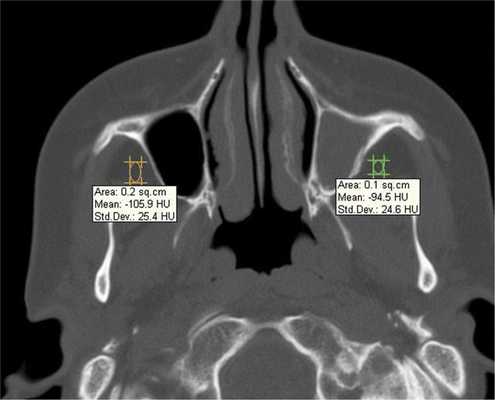При воспалительных изменениях в ретроантральной жировой клетчатке верхнечелюстной пазухи на РКТ повышаются денситометрические значения ее плотности [10]. При одностороннем процессе отмечается выраженная асимметричность значений плотностей (рис. 4).