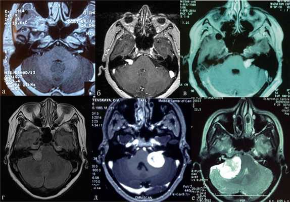 Рис. 2.Классификация неврином слухового нерва по M. Samii. а — Т1 — интрамеатальная опухоль (рис. 2, a); б —Т2 — интра-экстрамеатальная опухоль; в — Т3а — опухоль заполняет мостомозжечковую цистерну; г —Т3b — опухоль распространяется до ствола головного мозга; д —Т4а — опухоль вызывает компрессию ствола; е —Т4b — опухоль грубо деформирует ствол мозга и IV желудочек.