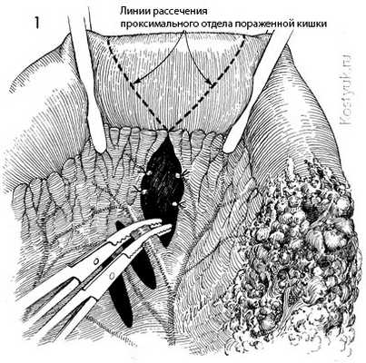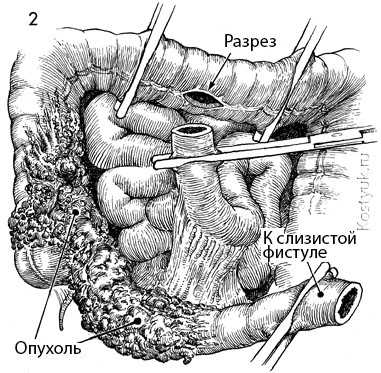 1 - Отделяется фрагмент кишки, ближайший к пораженному сегменту. Его брыжейка рассечена, сосуды зажаты и перевязаны. Разрез кишки происходит под углом.