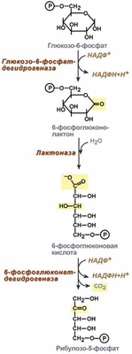 6Глюкозо-6-фосфат + 12NADP+ + 7Н20 ->-> 5Глюкозо-6-фосфат + 6С02 + 12NADPH + 12Н + + Н3Р04