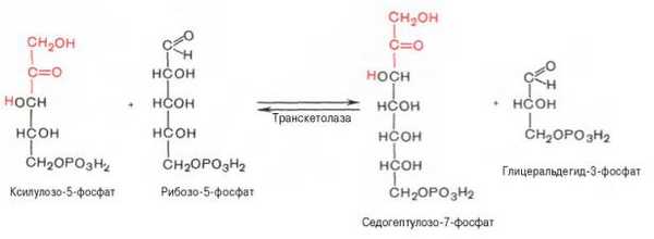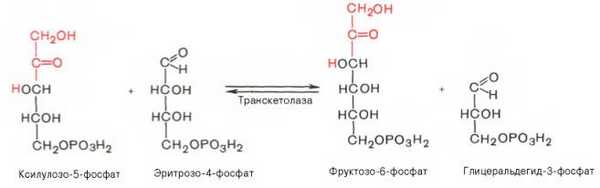 При определенных условиях наступает неокислительная стадия пентозофосфатного цикла, протекающая анаэробно: образуются вещества, характерные для гликолиза (фруктозо-6-фосфат, фруктозо-1,6-бисфосфат, фосфотриозы), и вещества, специфические для пентозофосфатного пути (седогептулозо-7-фосфат, пентозо-5-фосфаты, эритрозо-4-фосфат).