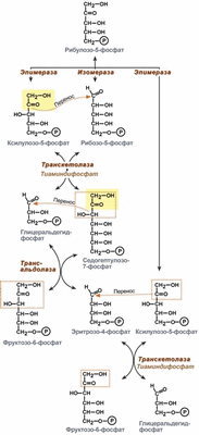 Неокислительный путь включает реакции переноса 2- и 3-х углеродных фрагментов с одной молекулы на другую. Этот путь служит для синтеза пентоз. Процесс обратим, и из пентоз могут образовываться гексозы.