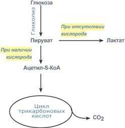 ![]() Пути метаболизма пирувата в присут- ствии и в отсутствии кислорода |