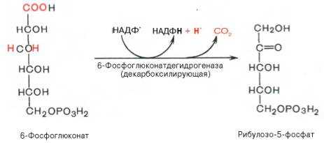 3). Дегидрирование и декарбоксилирование 6-фосфоглюконата с образованием рибулозо-5-фосфата (пентоза) и НАДФН при участии декарбоксилирующей 6-фосфоглюконатдегидрогеназы: