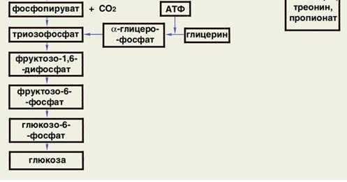 Схема: жир ; глицерин ; 3-фосфоглицерин ; ДОАФ ; глюкоза.