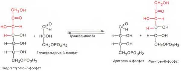 7). Трансальдолазная реакция - трансальдолаза катализирует перенос остатка диоксиацетона от седогептулозы-7-фосфата на глицеральдегид-3-фосфат: