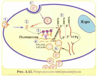 Продуктивный тип взаимодействия вируса и клетки получил название репродукции вирусов (от англ. rерroduсе — воспроизводить). Репродукция вирусов — это образование по принципу комплементарности и путем репликации копий вирусных нуклеиновых кислот и индуцирование молекулами последних биосинтеза вирусных белков с последующей самоорганизацией этих компонентов в вирусные частицы.