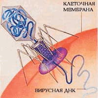 Рис. 7. Бактериофаги на бактерии (слева); бактериофаг вводит нуклеиновую кислоту в клетку бактерии (справа).