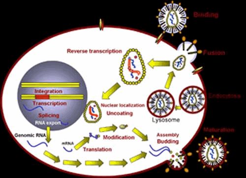 Рис. 5. Репродукция ВИЧ. Вирус прикрепляется к рецепторам клетки и, освободившись от суперкапсида, проникает в клетку. РНК вируса, проникнув в ядро, встраивается в ДНК после того, как с помощью фермента обратной транскриптазы РНК вируса трансформируется в ДНК. В дальнейшем на рибосомах синтезируются вирусные белки, образующие капсид. Происходит транскрипция РНК. Формируются вирионы, которые "одеваются" в мембрану клетки, выходя из нее.