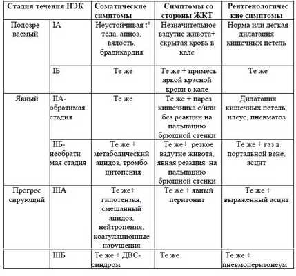 Стадия 1: подозрение на НЭК - вздутие живота, наличие в желудке не переваренного молока, наличие крови в кале, на рентгенограмме признаки НЭК отсутствуют или умеренная дилатация кишечных петель, нестабильная температура, апноэ, брадикардия.