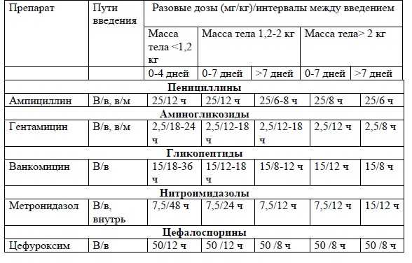 Таблица 2. Средние дозы антибактериальных препаратов у новорожденных [5,11].