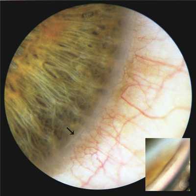 Офтальмостатус. Правый глаз: Vis OD=0,4, не корригируется, ROD M 0,5 дптр 100° — М 1,5 дптр 10°, внутриглазное давление (ВГД) 21 мм рт.ст. Придаточный аппарат без особенностей. Биомикроскопически отмечается небольшой по протяженности фрагмент заднего эмбриотоксона, расположенный в нижневнутреннем отделе окружности лимба. Гониоскопия: угол передней камеры открыт, переднее пограничное кольцо Швальбе в месте проекции заднего эмбриотоксона белой окраски, на его поверхности имеются остатки мезодермальной ткани радужки (рис. 1). Рисунок 1. Задний эмбриотоксон правого глаза больного К. (указан стрелкой). На вставке гониоскопическая картина этого участка. Пояснения в тексте. Других изменений переднего отрезка и оптических сред не отмечено.
