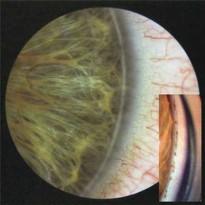 Левый глаз: Vis OS=0,3, не корригируется, ROS M 0,5 дптр 95° — H 0,5 дптр 5°, ВГД 20 мм рт.ст. Придаточный аппарат без особенностей. Биомикроскопически отмечается протяженный задний эмбриотоксон, практически занимающий 2 /3 окружности лимба (наружный, верхний и нижний отделы). Гониоскопия: угол передней камеры в целом открыт, однако отмечаются отдельные гониосинехии, экранизирующие шлеммов канал. Переднее пограничное кольцо Швальбе в области заднего эмбриотоксона более интенсивного белого цвета, чем на правом глазу. На поверхности кольца скопления остатков мезодермальной ткани радужки в большем количестве, чем в правом глазу (рис. 3). Рисунок 3. Задний эмбриотоксон левого глаза больного К. На вставке гониоскопическая картина этого участка. Пояснения в тексте. Других изменений переднего отрезка и оптических сред не отмечено.