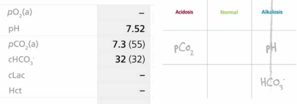 pH: 7,52, pCO2: 55 мм рт. ст., HCO3: 32 ммоль/л