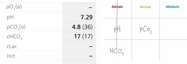 Как мы видим, показатели рН и НСО3 смещаются в сторону алкалоза, а показатель рСО2 — в сторону ацидоза.
