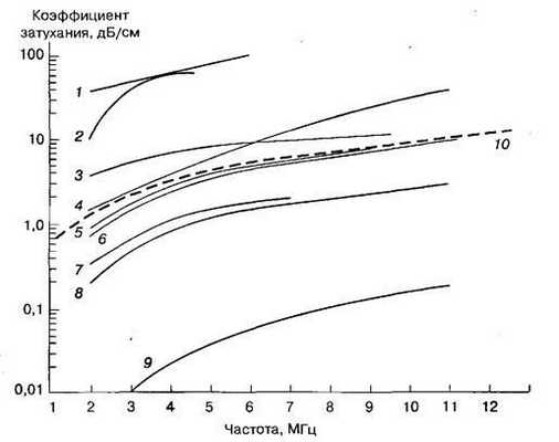С помощью этой цифры очень легко определить среднее затухание на любом расстоянии на частотах ультразвука, применяемых в диагностике.
