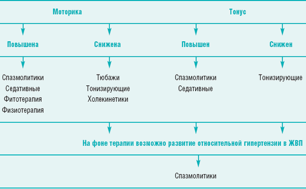 Коррекцию нарушений моторики ЖВП начинают с поиска причины и ее устранения - лечения основного заболевания ЖВП, коррекции вегетативного статуса и т.д. (табл. 1)
