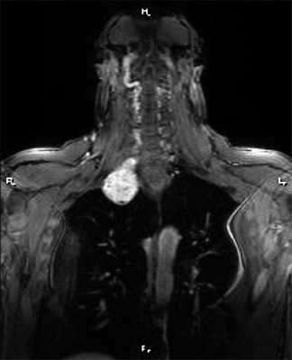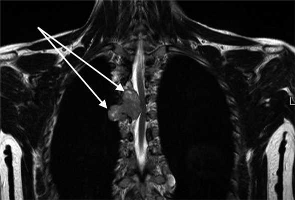 Рис. 3. Магнитно-резонансная томограмма пациента с цервико-медиастинальной нейрогенной опухолью, проникающей в средостение через верхнюю апертуру, фронтальный срез.