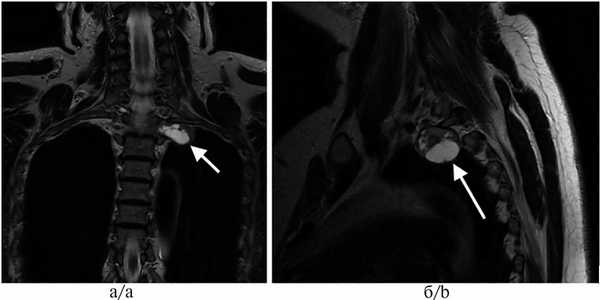 Рис. 2. Магнитно-резонансные томограммы пациента с апикальной нейрогенной опухолью, проникающей в межпозвонковое отверстие.