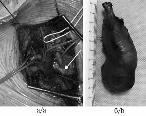 а — вид операционной раны после удаления опухоли (красная держалка на подключичной артерии, синяя — на внутренней яремной вене, бифуркация плече-головного артериального ствола указана стрелкой); б — макропрепарат.