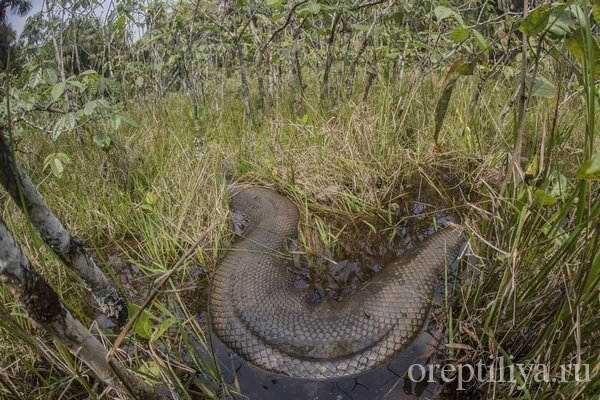 Часто анаконды закапываются в ил и впадают в спячку до тех пор, пока водоем вновь не наполнится.