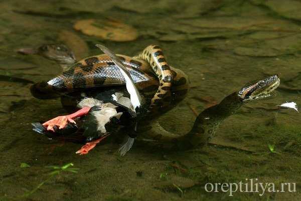 Взрослые анаконды охотятся на птиц, капибар, диких кабанов, кайманов, игуан, агути, других змей.