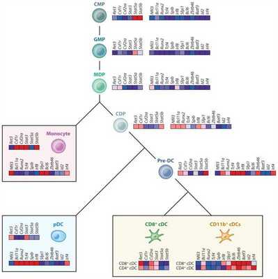 Рисунок 1 | Транскрипционный контроль дифференциации ДК. На иллюстрации изображена тепловая карта цитокинов, TLR и некоторых факторов транскрипции, которые экспрессируются в миелоидной линии, начиная от обычных миелоидных предшественников (CMP) до предшественников гранулоцитов макрофагов (GMP), предшественников макрофагов ДК (MDP), общих предшественников ДК (CDPs), циркулирующих кДК-предшественников (pre-cDCs), моноцитов, плазмоцитоидных ДК (pDCs) и клеток лимфоидной ткани CD8+ и CD11b+ ДК.