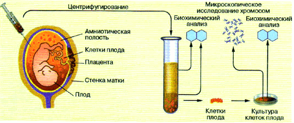 Наибольшее значение имеет исследование околоплодной жидкости — амниоцентез. Известно, что в ней содержатся вещества, выделяемые развивающимся зародышем, а также некоторое количество зародышевых клеток. На 16-й неделе беременности с помощью шприца берётся проба амниотической жидкости в количестве 15—20 мл. После центрифугирования клетки плода выращиваются в культуральной среде в течение двух недель. Далее проводится микроскопическое исследование хромосом. В случае обнаружения серьёзных нарушений беременность рекомендуют прервать. Современные методы позволяют диагностировать более 60 наследственных заболеваний.