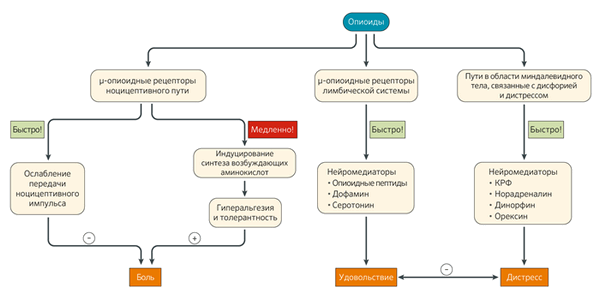 Опиоиды стимулируют μ-опиоидные рецепторы (MOR) в ноцицептивном пути, что приводит к быстрому снижению передачи ноцицептивного импульса при боли. Со временем медленное высвобождение возбуждающих аминокислот приводит к развитию толерантности и гипералгезии. Стимуляция MOR в лимбическом пути приводит к быстрому высвобождению нейротрансмиттеров (включая дофамин, опиоидные пептиды и серотонин), которые вызывают чувство эйфории и/или удовольствия. Со временем и вследствие отсутствия опиоидов становятся активными пути, приводящие к высвобождению нейротрансмиттеров, таких как кортикотропин-рилизинг-фактор, норадреналин и динорфин, вызывающих дисфорию и/или дистресс