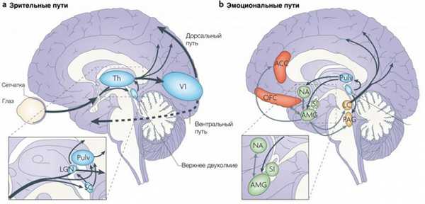 И зрительная и "эмоциональная" система очень сильно связаны, особенно на подкорковом уровне, поскольку верхнее двухолмие (SC) взаимодействиет с амигдалой (AMG) через подушку (Pulv). Существуют прямые соединения между кортикальными и субкортикальными структурами, ответственными за эмоции (например между орбитофронтальной корой (OFC) и амигдалой (AMG) или между орбитофронтальной корой и передней поясной корой (ACC), а также между субкортикальными структурами и зрительными зонами (например между амигдалой и височной корой), а также между ядрами ствола и корой (из всех ядер ствола показано только голубое пятно). Серые стрелки отображают соединения внутри "эмоциональной" системы.