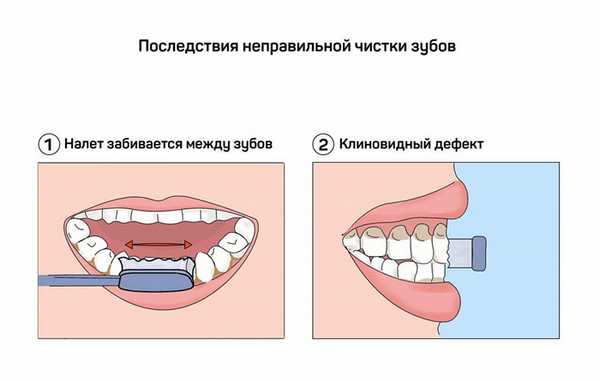 Большинство из нас чистит зубы на автомате и неправильными движениями - двигая зубной щеткой влево-вправо. При таком способе чистки мягкий налёт переносится с поверхности зубов в межзубные промежутки. В итоге возникает опасность повреждения дёсен и появления клиновидного дефекта в районе соприкосновения с десной.