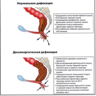 - диссинергия мышц тазового дна, которая характеризуется парадоксальным сокращением или невозможностью расслабления мышц тазового дна при попытке совершить акт дефекации;