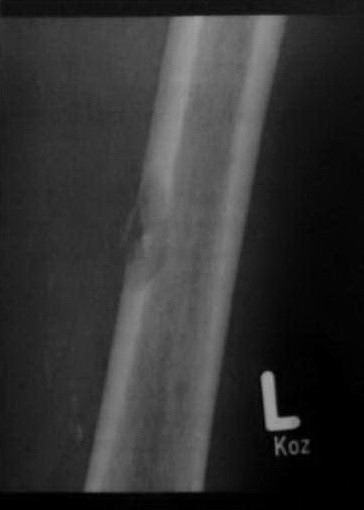 Женщина 89 лет. На рентгенограмме виден метастаз в кортикальный слой левой бедренной кости. Деструкция кортикального слоя. Первичная опухоль не установлена.